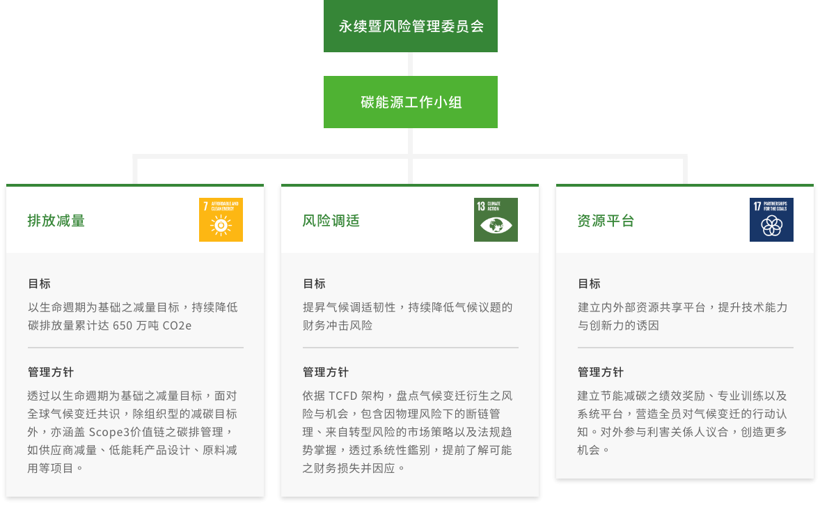 ESG暨气候委员会下辖之气候变迁议题管理,由制造营运副总所领导的碳能源工作小组为统筹管理组织。