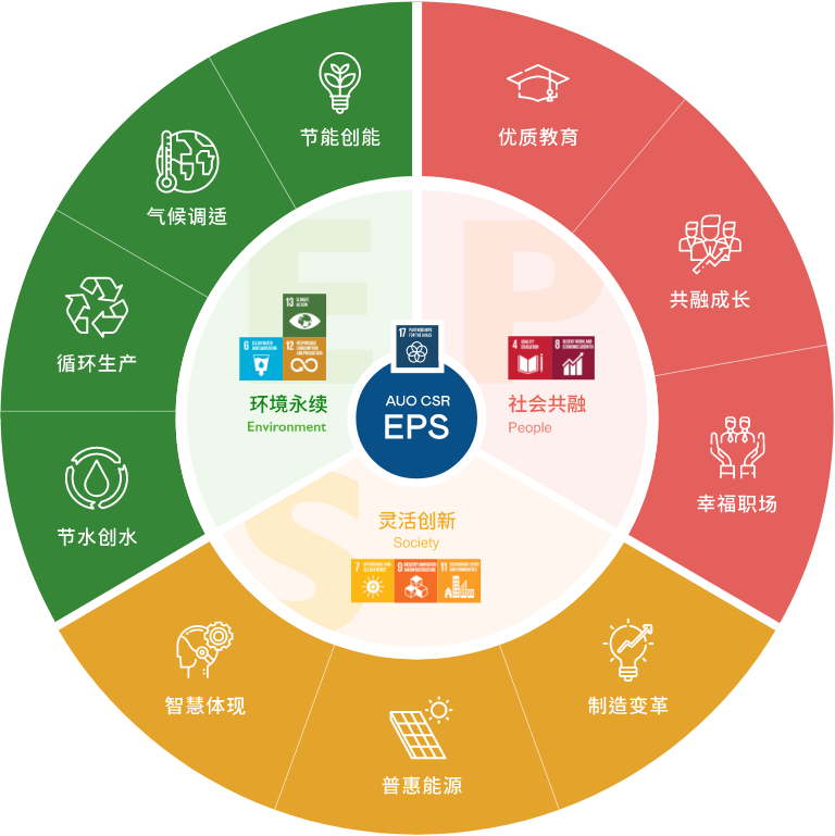 根据联合国所发展的17项永续发展目标,米兰milan光电以「超越企业社会责任,创造共享价值」为企业永续愿景发展蓝图,订出环境永续、共融成长与灵活创新的EPS(Environment, People & Society)三大永续发展主轴;以响应日益受关切的环境议题与社会共融趋势。