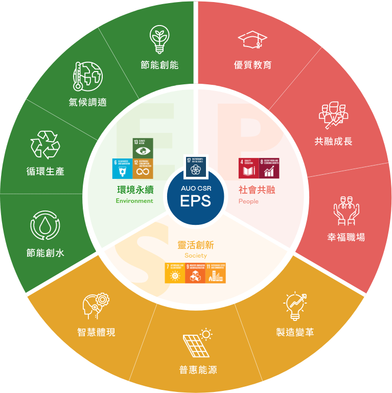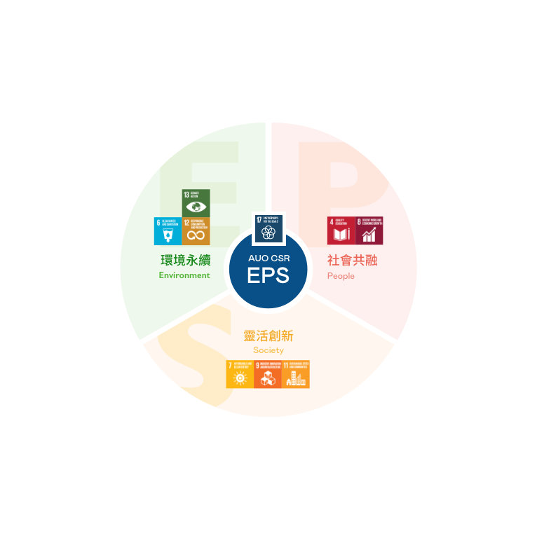 根據聯合國所發展的 17 項永續發展目標,米兰milan光電以「超越企業社會責任,創造共享價值」為企業永續願景發展藍圖,訂出環境永續、共融成長與靈活創新的 AUO EPS ( Environment,People & Society ) 三大永續發展主軸,以回應日益受關切的環境議題與社會共融趨勢。