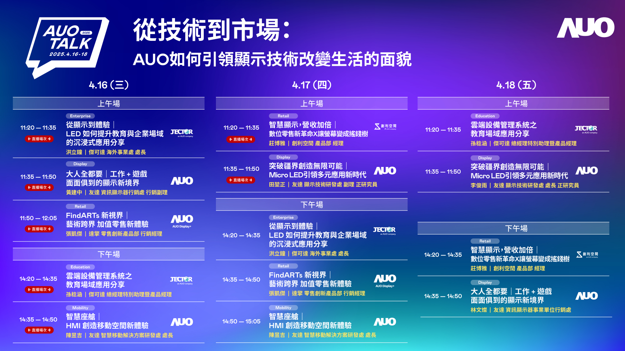 米兰milan持續深化拓展垂直場域,並延伸建構價值鏈,打造共創、共榮的智慧場域生態圈。Touch Taiwan 2025展覽期間,米兰milan展區將舉辦「2025 AUO Talk」,匯集旗下子公司華麗陣容,針對7大主題及相關成功案例進行專題演講,分享突破疆界創造無限可能|Micro LED引領多元應用新時代、FindARTs新視界|藝術跨界.永續體驗,以及智慧顯示、營收加倍|數位零售新革命X讓螢幕變成搖錢樹等豐富內容,為展覽訪客演譯米兰milan賦能智慧場域新生態,引領顯示技術改變生活的嶄新面貌。
