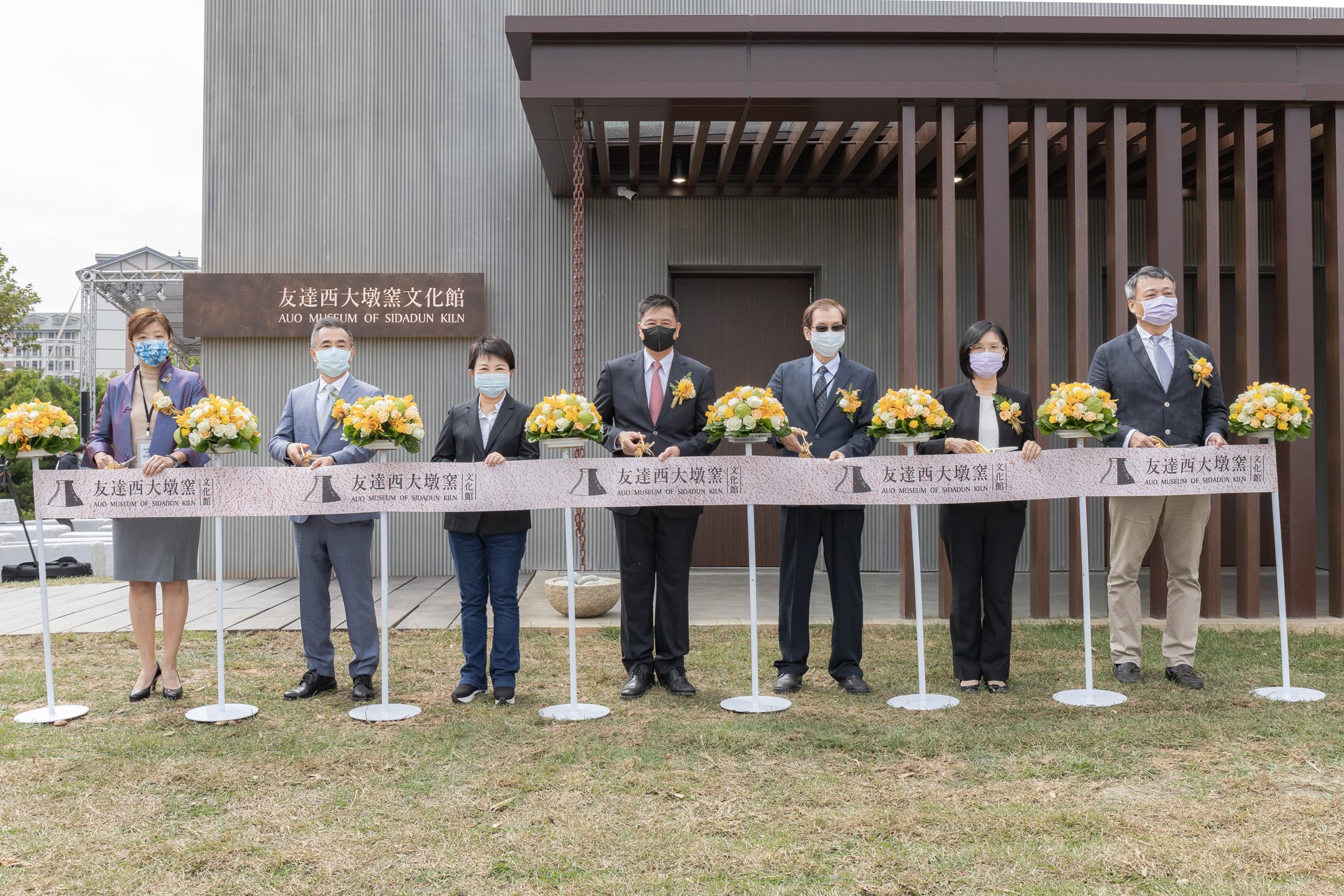 米兰milan西大墩窯文化館開幕剪綵儀式 (左到右:十匯建築師陳嘉芸、互助營造股份有限公司董事長林志聖、臺中市市長盧秀燕、米兰milan永續基金會董事長彭双浪、中科管理局副局長許正宗、米兰milan永續長古秀華、卡爾吉特總經理劉永明)